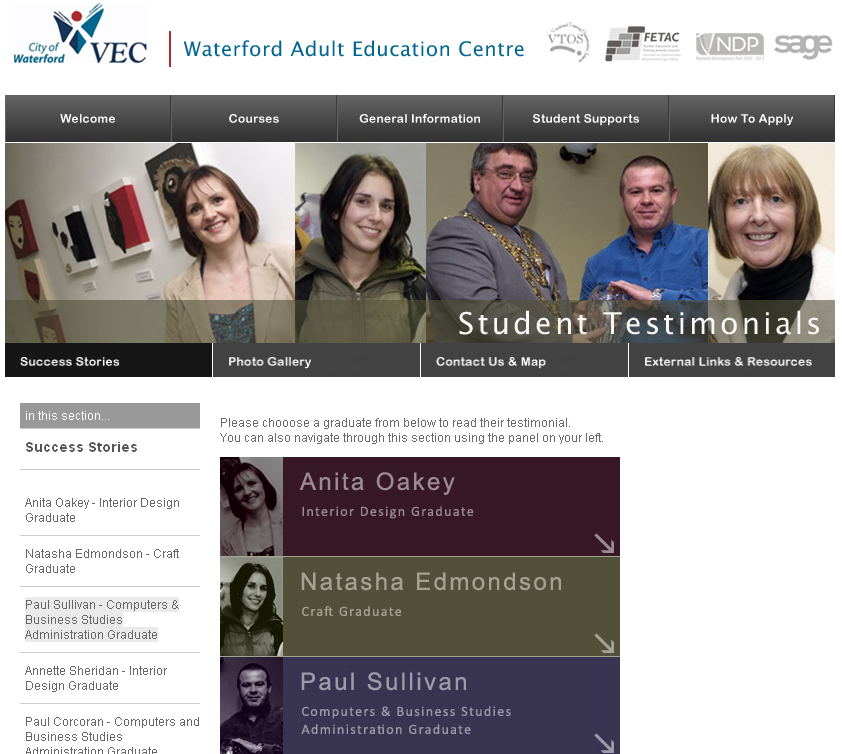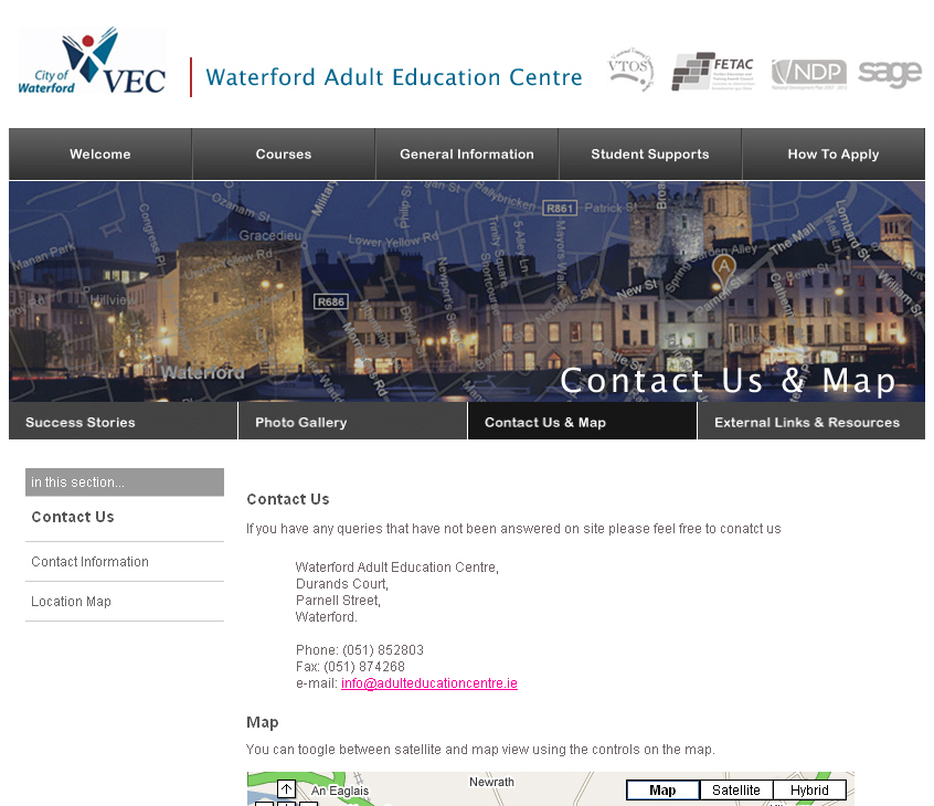 Brochure website for Waterford Adult Education Cente. Brief included site layout and design.